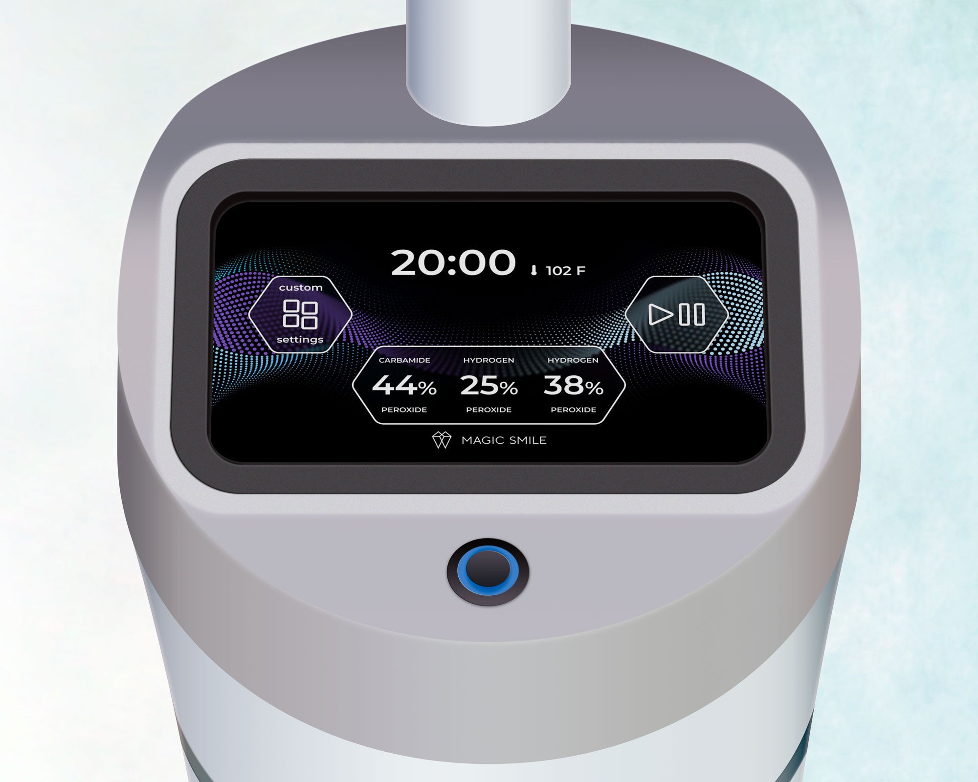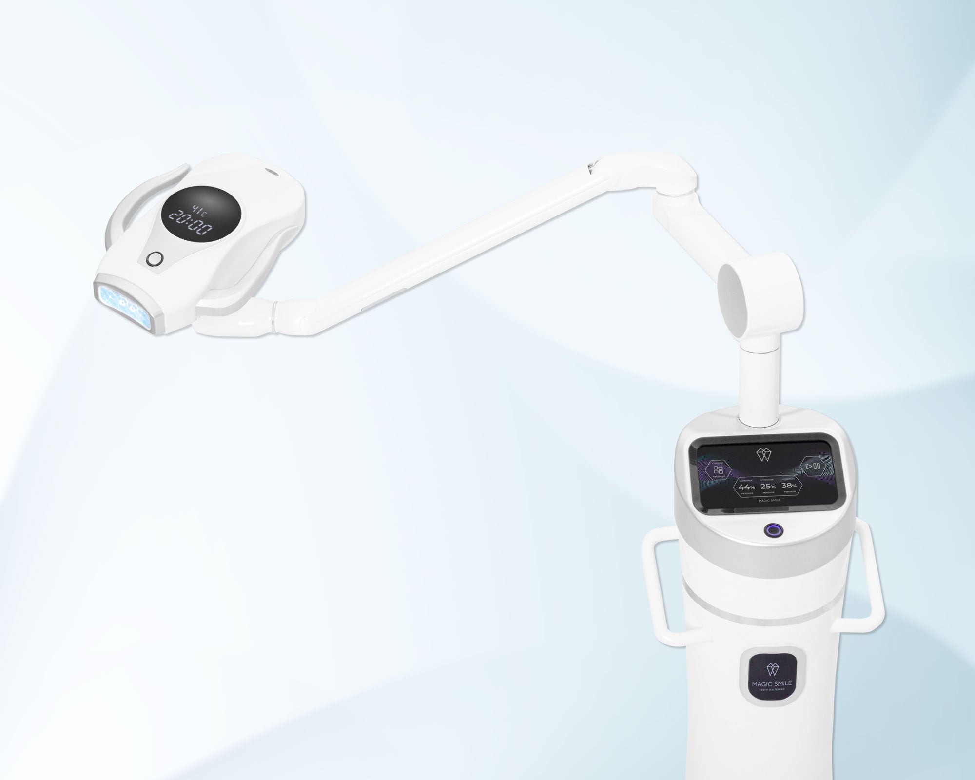 - Magic Light Pro+ забезпечує легке керування процедурою відбілювання і швидкий запуск процедури. Одним дотиком оберіть режим, який відповідає нанесенному гелю, і запускайте процедуру відбілювання